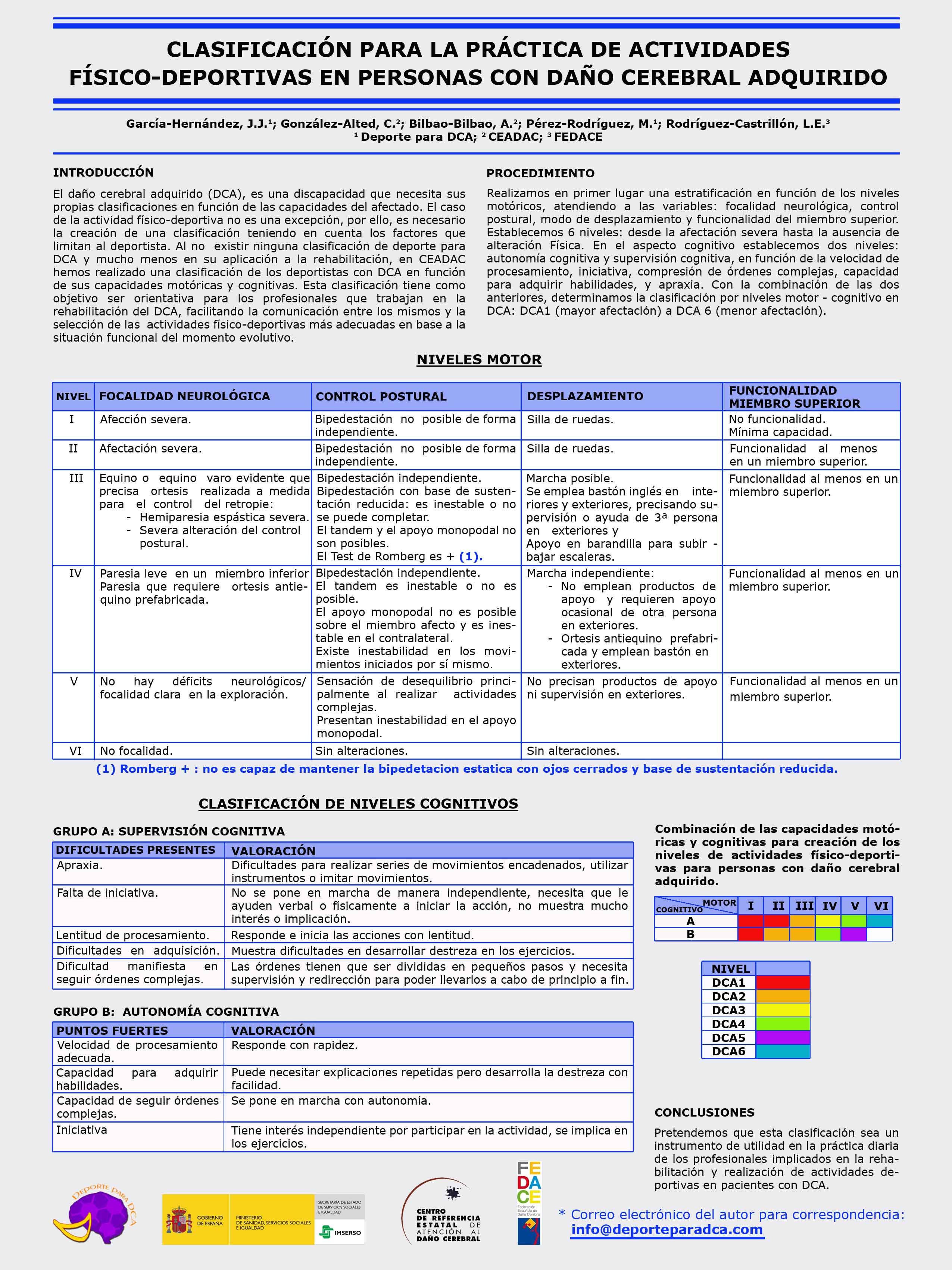 La semana del 29 de septiembre al 2 de octubre, se celebró en el INEF el Congreso Europeo de Actividad Física Adaptada (EUCAPA) en el que Juanjo García, ;Marta Pérez y Carlos González presentaron un póster sobre la clasificación por niveles motor-cognitivos de las personas con daño cerebral adquirido (DCA) para la práctica deportiva. Esta clasificación se desarrolló con la colaboración del equipo médico y de los terapeutas deportivos, teniendo en cuenta déficits físicos y cognitivos, a fin de realizar una prescripción de ejercicios adecuada a las capacidades de los deportistas.
