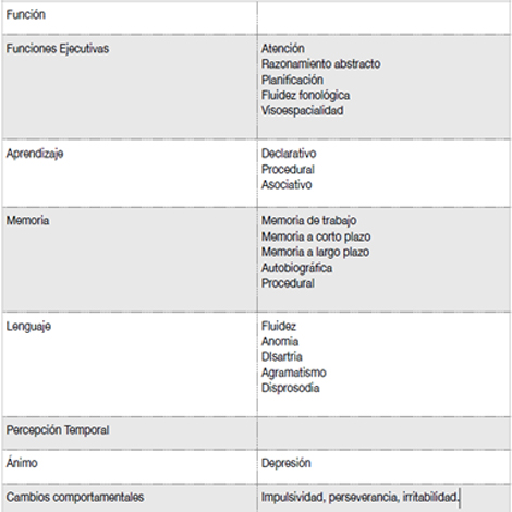 Tabla 2. Déficits cognitivos y otras alteraciones en pacientes con lesiones cerebelosas. (Modificado de Maite Barrios 2001).