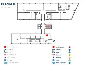 Planos accesibles: situados en las dos plantas del edificio. Contienen relieve y braille, los cuales sirven para facilitar la orientación a personas con déficit visual. También se incluye el uso del color coincidente con las diferentes zonas y funciones del centro.